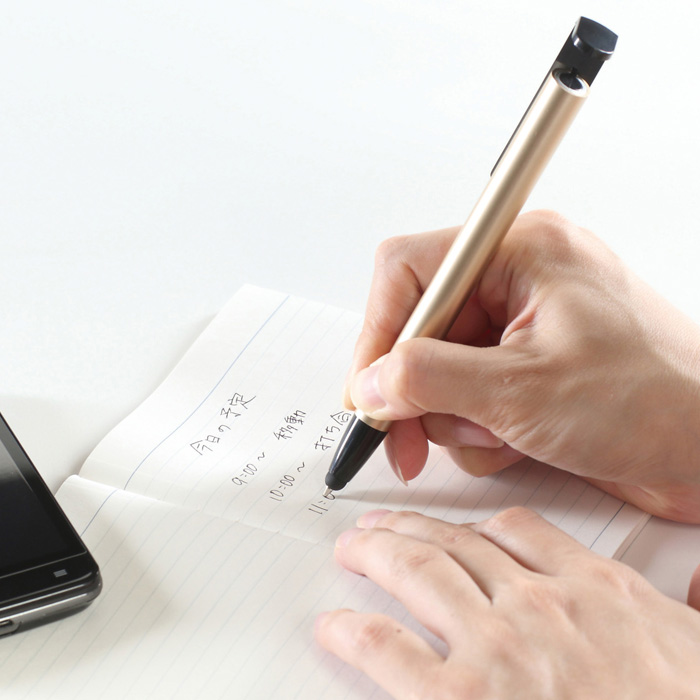 4WAY(ボールペン・タッチペン・スマホクリーナー・スタンド)の機能を1本で収納した複合筆記具です。本体色は高級感あふれるゴールドとシルバーを採用しています。のし箱付なので印刷をすれば記念品としても使えます。
