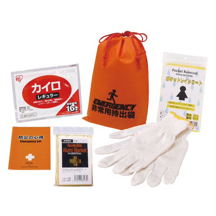 収納ショルダーバッグ・アルミブランケット・軍手・IDホイッスル&カラビナリング・レインコート・携帯用トイレ1P・ダイナモLEDライト・防災の心得 |