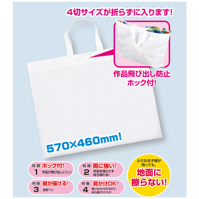 4切サイズが折らずに入ります!作品飛び出し防止ホック付!小さなお子様が持っても、地面に擦らない! 雨に強い! 絵が描ける! 肩かけOK!