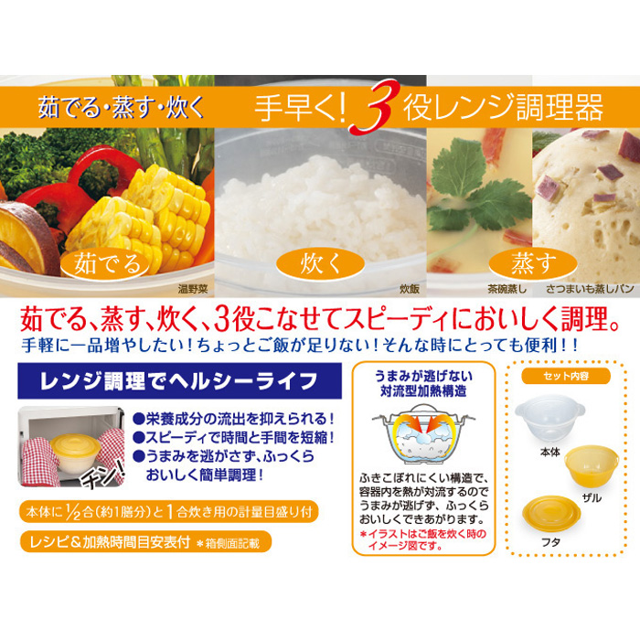 茹でる・蒸す・炊くの3役を手早く行える便利なレンジ調理器。手軽に1品増やしたい!ちょっとご飯が足りない!そんな時にとっても便利。栄養成分の流出を抑えられる!スピーディで時間と手間を短縮!うまみを逃さず、ふっくらおいしく簡単調理!