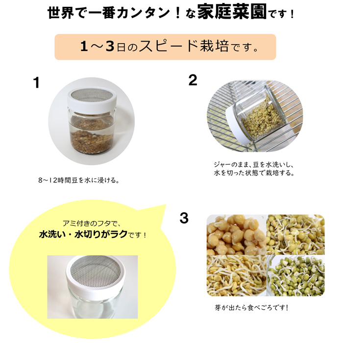 欧米で人気の育てるスーパーフード「発芽豆」がカンタンに栽培できるスターターキット。発芽したての豆は栄養豊富。生で食べられるので酵素もたっぷり摂れる健康フードです。栽培方法:付属の乾燥豆をジャーに入れ、たっぷりの水に約12時間浸けます。浸け終わったら豆を水洗いし、水を切った状態でジャーの中で発芽させます。栽培開始から2~3日、ちょっと発芽した状態が食べごろです。よく洗い、生でサラダにトッピングしたり、炒め物やカレー、煮物、スープにしてもおいしい。水切りアミ付きのフタなので、水洗い・水切りが楽にできる発芽豆栽培専用ジャーです。有機JAS認証取得の有機の豆で安心して栽培をお楽しみいただけます。発芽豆を使ったレシピ付き。レンズ豆:ほんのり甘く、煮るとトロ~りやわらかい。