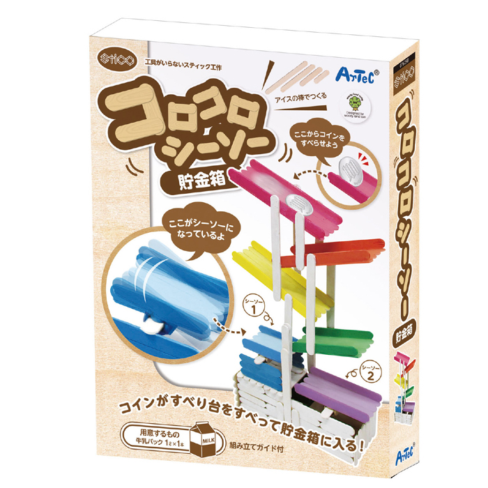 コインがすべり台をすべって貯金箱に入る!アイスの棒でつくるシーソー貯金箱。子供会のイベントや、工作教室・クラフト教室などのイベントにオススメです。