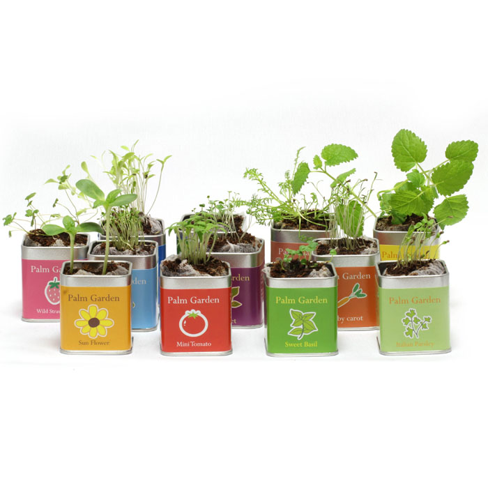 パーム(手のひら)サイズの小さな缶で育てる栽培キット。小さいからデスクでも、狭い窓際でも、日当たりが良ければどこでも栽培可能です。オリジナルデザイン対応可。ノベルティに最適。【原産国】種:海外各地・土:スリランカ・他:日本