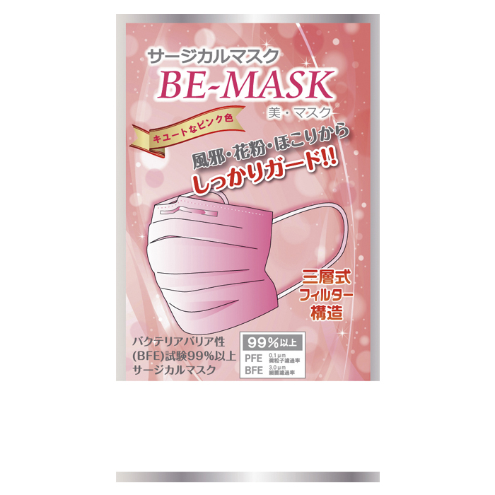 女性に大人気!綺麗なピンク色のマスクです。BFE99%以上。女性向けの景品や粗品としてオススメです。
