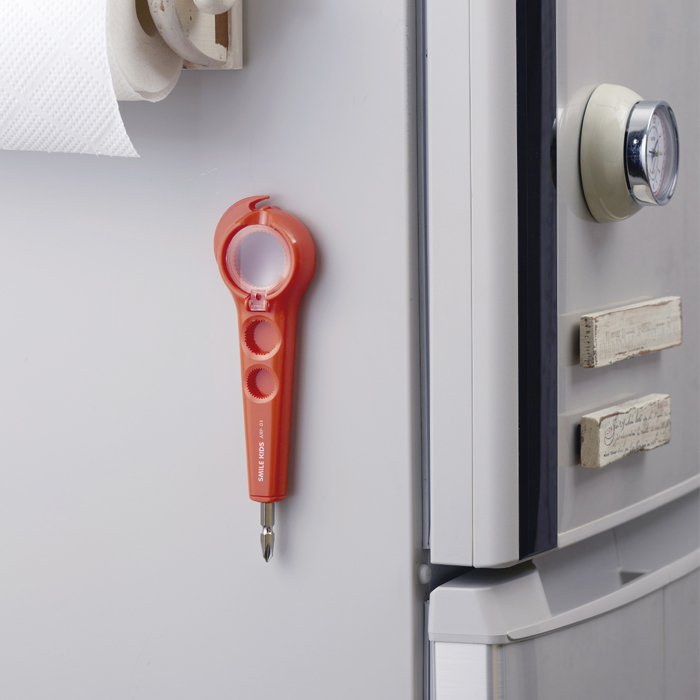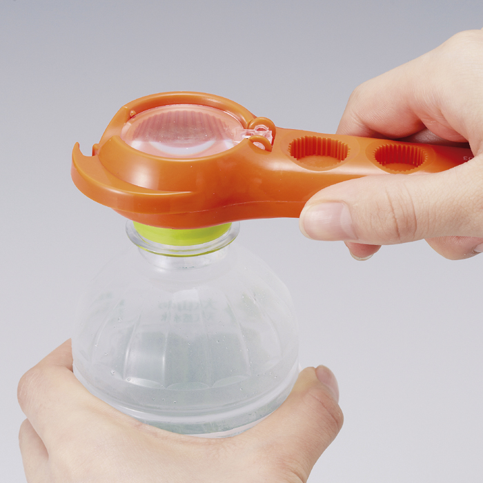 サイズ・形状の違う5種類のキャップをあけることができます。プラス・マイナスドライバー付。小さな文字が見やすいルーペ付。マグネットもついているので冷蔵庫などにつけておけばすぐ使えます。