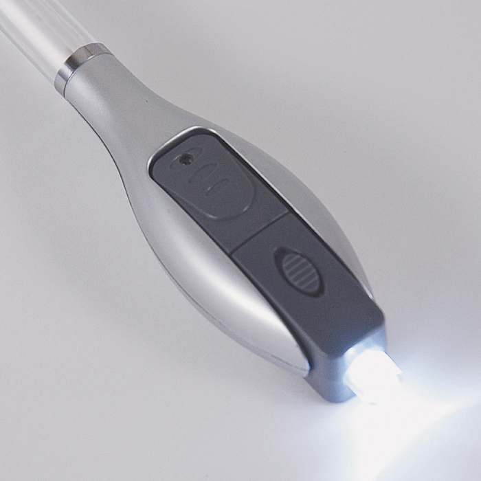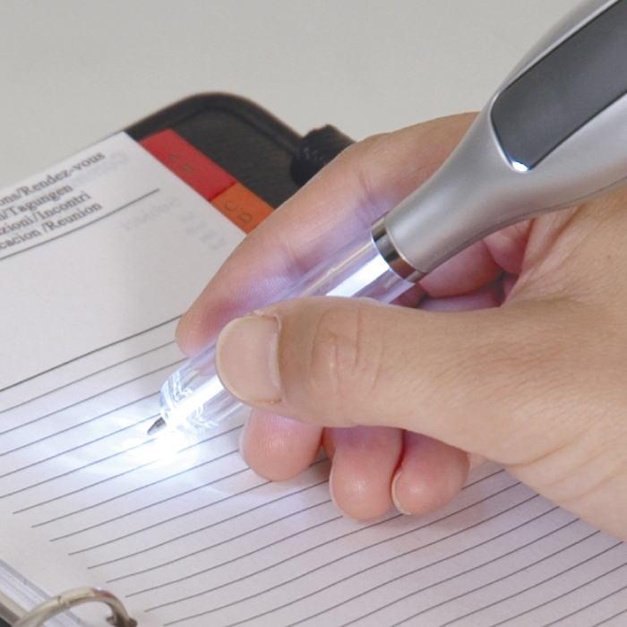 暗い場所でもペン先を明るく照らし、ライト部分を回転させると白色LEDライトとしても使えます。首から吊るせる、便利なストラップ付。ボールペンは名入れをして景品やノベルティとして人気です。