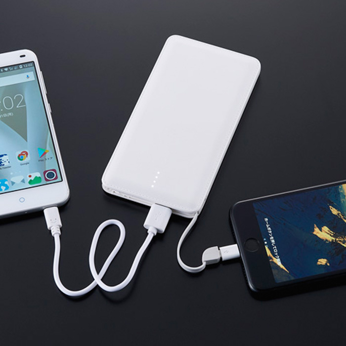 スリムで持ち運びに便利な10,000mAhの充電池。充電コード内蔵でコード携帯不要で充電が可能。iPhone6、7充電用端子も本体に内蔵しています。更に本体にUSB充電ポート付で2台同時に充電も可能です。カード型で名入れ範囲が大きく、フルカラー印刷も綺麗に入ります。充電インジケーター付。
