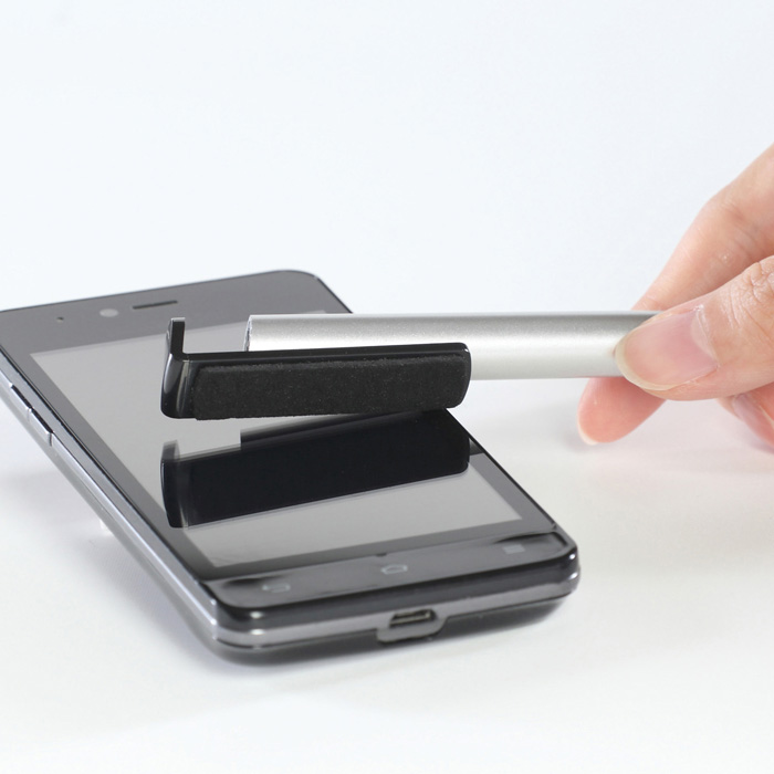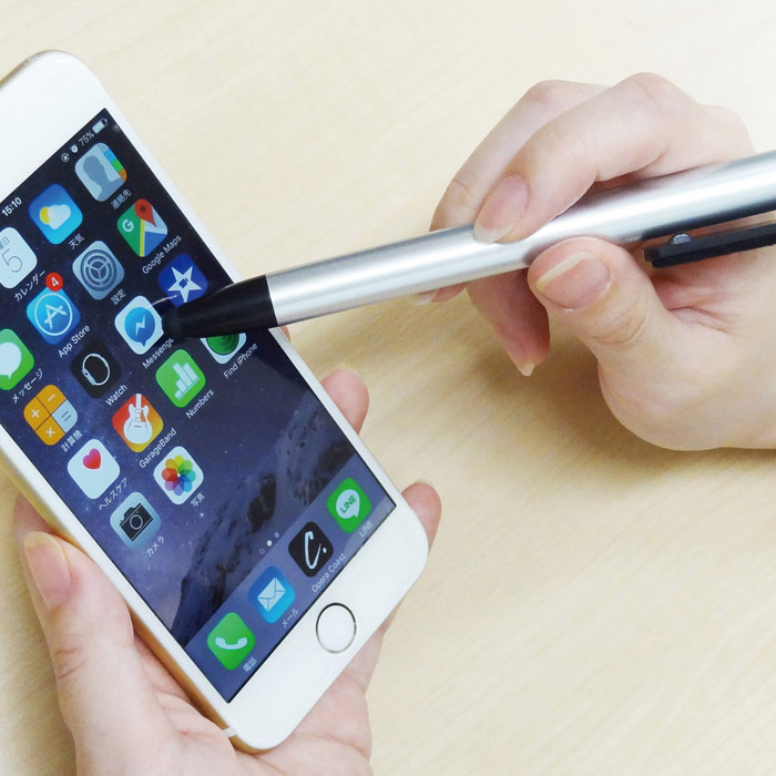 4WAY(ボールペン・タッチペン・スマホクリーナー・スタンド)の機能を1本で収納した複合筆記具です。本体色は高級感あふれるゴールドとシルバーを採用しています。のし箱付なので印刷をすれば記念品としても使えます。