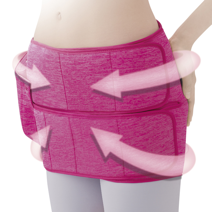 骨盤・おしりをギュッと引き締めマッサージ!おしりのひきあげ感アップ!コードレスでかんたん・手軽、ながらリフレッシュ。選べる4つのコース、強さ調整3段階、ベルト対応サイズ80~110cm。医療機器認証番号:301AKBZX00007000。