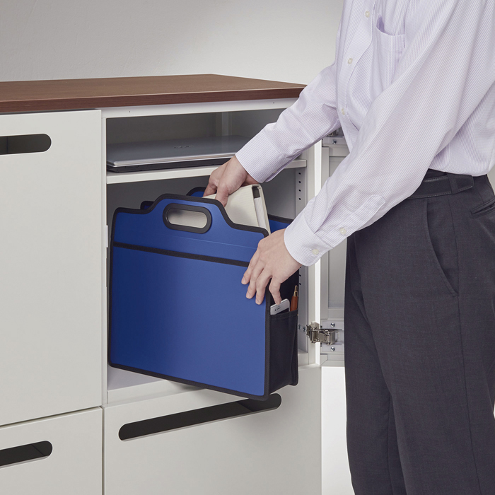 会議などへ持ち運び便利な社内移動用バッグ。PPシート製なので耐久性があり、使わない時はマチ部分をたためるので収納もコンパクトです。正面にはA4サイズの収納があり、側面には小物ポケット付です。