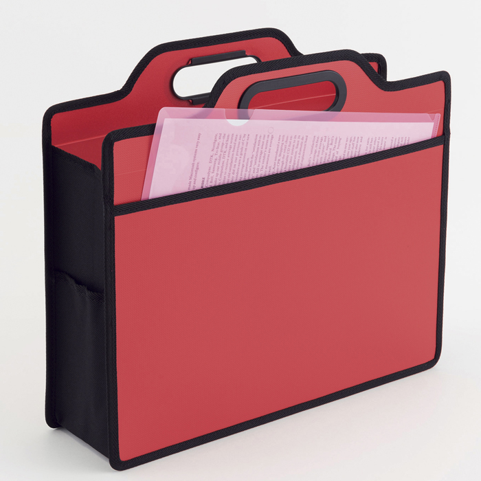 会議などへ持ち運び便利な社内移動用バッグ。PPシート製なので耐久性があり、使わない時はマチ部分をたためるので収納もコンパクトです。正面にはA4サイズの収納があり、側面には小物ポケット付です。