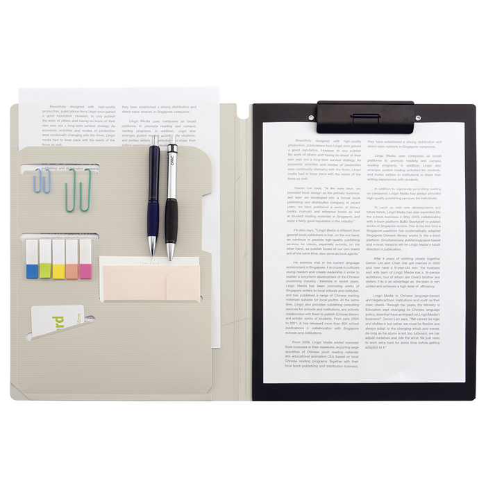マルチポケット&外側ポケットがついて、一時保管や書類の分類がしやすいクリップファイル。適正収納枚数:コピー用紙40枚。ビジネス向けの記念品や景品としてオススメです。