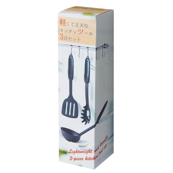 鍋やフライパンを傷つけにくいナイロン製キッチンツール。1本あたり約60gという軽さです。食洗機対応。鍋のふちにひっかけておけるストッパー付(3本共通)で使い勝手も抜群。レードルは鍋底に沿わせやすくたっぷりすくえる特殊な形状です。