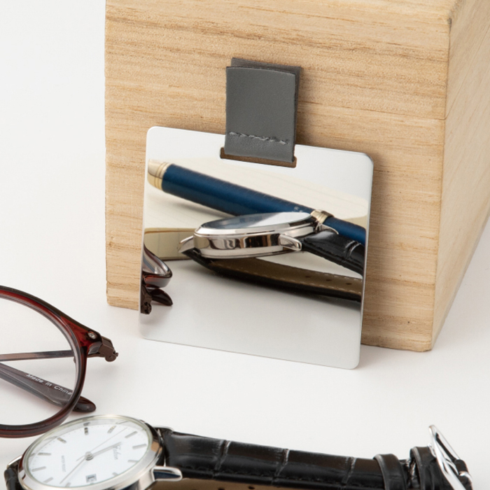 バッグの外ポケットや胸ポケットなどの小スペースに収納できる、携帯に便利なカード型ミラーです。常に携帯いただく前提で、頑丈なステンレス製を採用いたしました。落としても割れず、薄くて軽い、安心・安全品質です。郵送も可能なサイズですので、DMなどへの同梱もご検討ください。美容用品のノベルティとして、展示会・体験会などでの配布など、さまざまな場面でご利用いただけます。誰もが使う「ミラー」ですから、老若男女、お渡しする相手を選びません。また、長く使用するミラーは、名入れすることで高い販促効果を発揮します。シンプルなグレーを基調としたカラーは、ビジネスシーンにピッタリです。他色の商品もございますので、あわせてご検討ください。