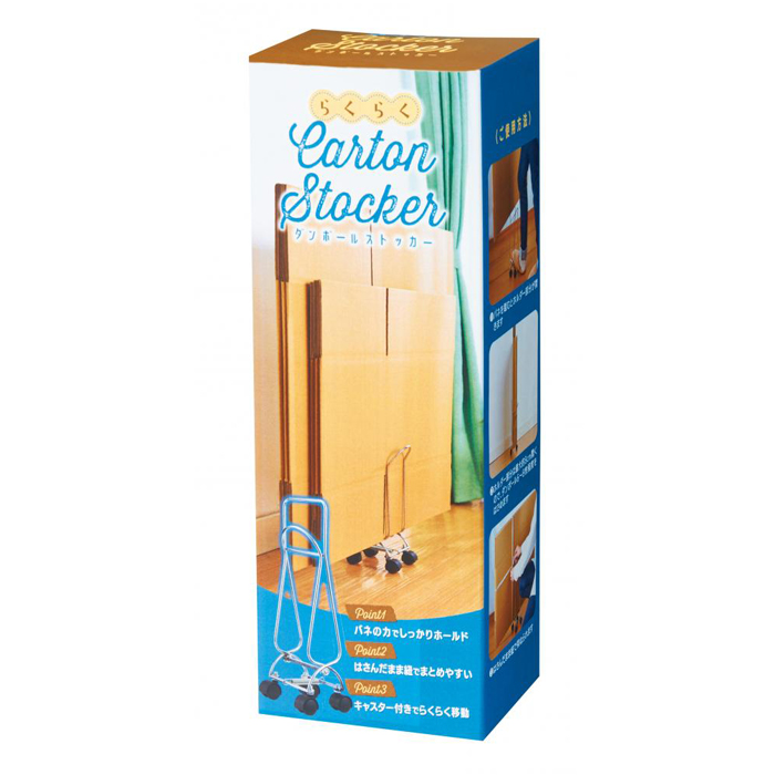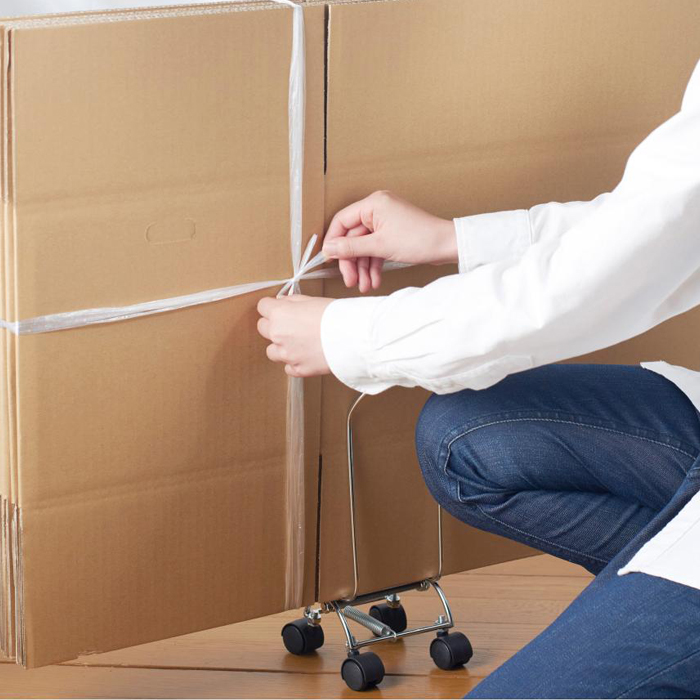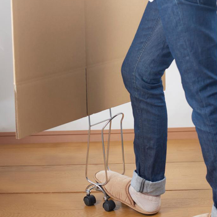 次の資源回収日までのダンボールの指定席!省スペース&扱いラクラクのダンボールストッカー。ダンボールを入れやすい・束ねやすい・運びやすい!本体下部のバネを踏むと上が開き、ダンボール6~8枚程度を挟めます。床から浮くので紐で束ねやすく、キャスター移動やハンドキャリーで玄関や集積場所への移動もラクラク!使うほどに便利さを実感できるアイテムです。