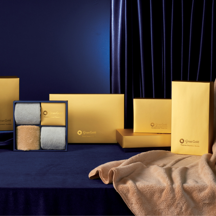 煌めくゴールド箱入りのギフト商品。積み上げるだけで注目度高まるディスプレイに。ふんわり心地よい肌触りのバスタオルギフト。各種景品や販促品、記念品としてオススメです。