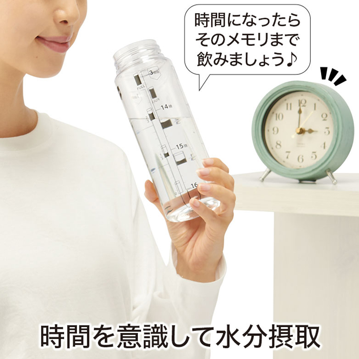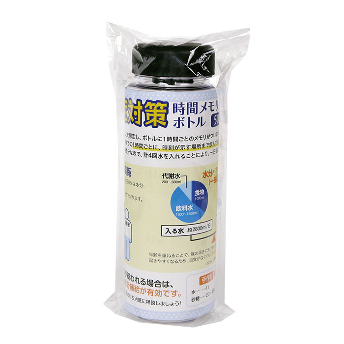 水を飲むことは、脱水症対策だけでなく、疲労回復・血流改善・便秘解消・リラックス効果の発揮など、様々な効果が期待できます。水は、一日に2リットル飲むのが良いとされています。本商品は、ボトル本体に「1時間ごとのメモリ」がついていて、それに従えば、無理なく自然に水分を摂取することができます。さらに、付属のマニュアルには脱水症対策情報が満載!様々な世代のみなさまの健康管理をサポートいたします。脱水症・熱中症対策にはもちろん、健康・フレイル対策関係イベントなどでの採用、是非ご検討ください。食品検査済。