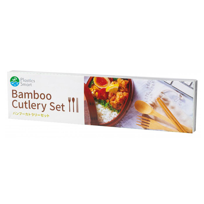 商品はもちろん、包装に至るまでプラスチックフリーのカトラリーセット。出先で便利な竹製のカトラリーセットをナチュラルなコットン巾着にセットしました。化粧箱の裏面にはプラスチック・スマートの説明入り。各種景品や販促品としておすすめです。
