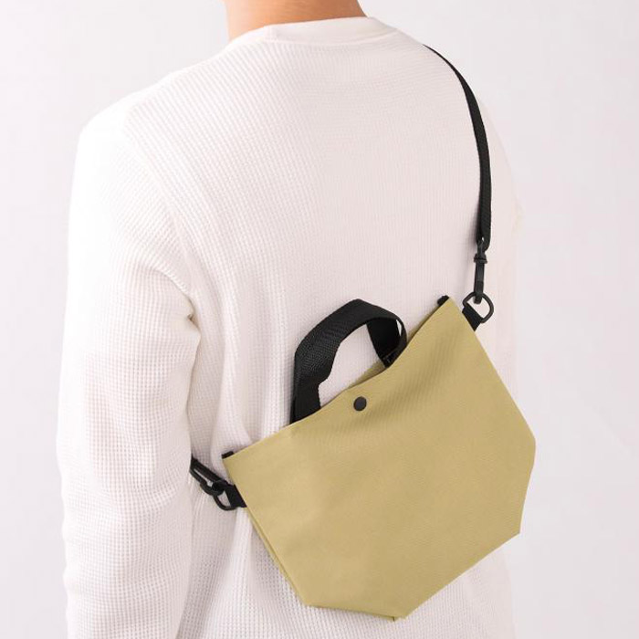 自在に2WAY!スマートにサコッシュ、マチを広げてミニトート!サイド下部のボタンの留め外しでシーンに合わせた形状で使えます。取り外しできるアジャスター付きショルダーベルトも高ポイント!各種景品や販促品としておすすめです。