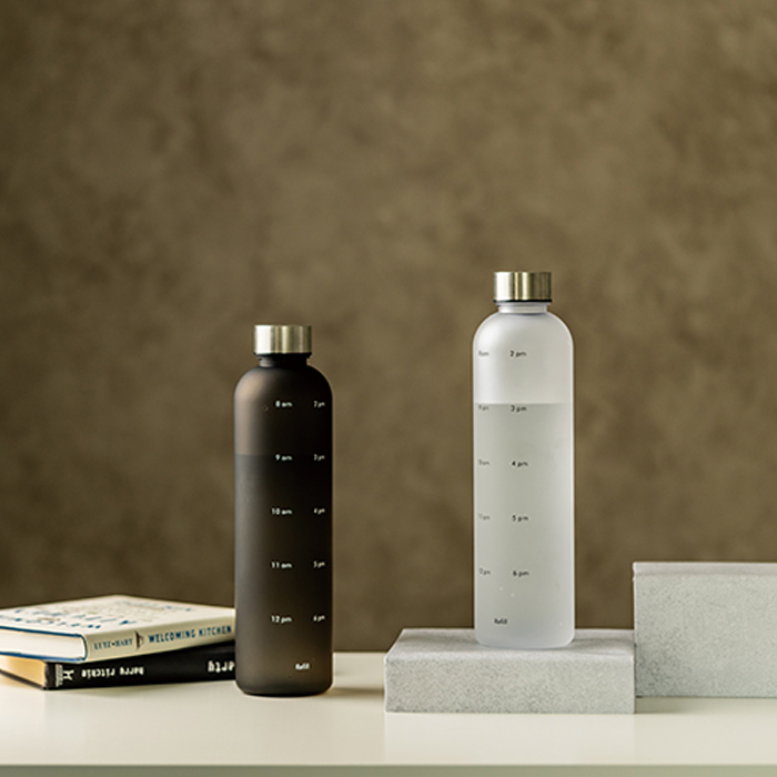 1時間ごとの飲む量を管理できる目盛り付きボトルで毎日の水分補給を確実に。1Lサイズのボトルに午前8時から午後6時までの時間目盛りが付いているので次の目盛りまで1時間かけて飲むことで水分補給を習慣化できます。シンプルでおしゃれなフロスト加工なので名入れデザインが映えます。スポーツイベントや美容関連のノベルティとしてオススメのアイテムです。