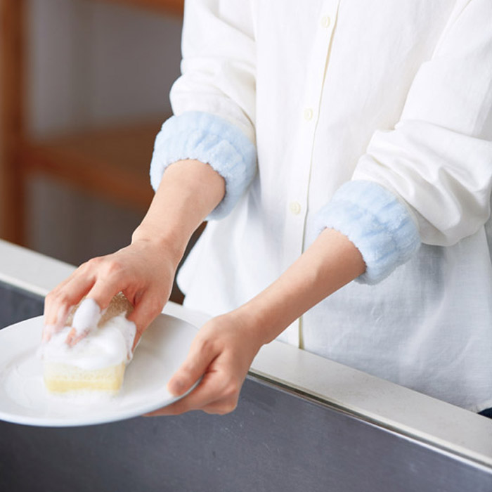 水気を吸収して、袖を濡らさない便利グッズ。腕につけて、洗顔時や食器洗い時に大活躍!ディスプレイ映えする透明の筒ケース入り。各種景品や販促品としてオススメです。