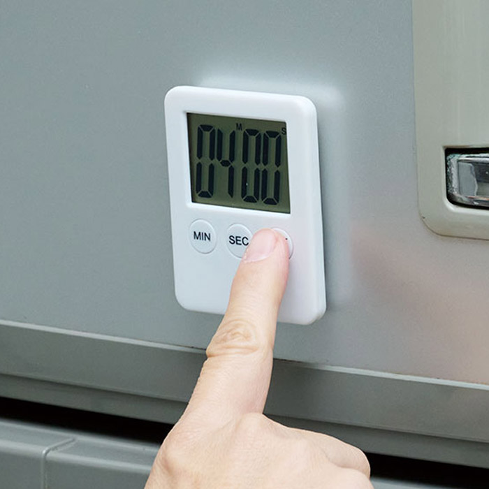 大きな画面でとっても見やすいキッチンタイマー!ノベルティグッズの定番アイテムとして高い人気があります。手のひらサイズで使いやすく、カウントアップ・ダウンのどちらも可能。3つの操作ボタンで、どなたでもカンタンにご利用いただけます。背面はマグネット付きで、冷蔵庫等にピタッと貼り付けることができて、とっても便利♪すべり止めもついているので、机・テーブルの上でも安定、安心です。企業・団体のロゴやメッセージを「名入れ」すれば、PR効果は抜群!キッチンで目にするたび、使うたびにその効果を繰り返し発揮します。本商品は、名入れが映えるシンプルな「ホワイト」カラーですが、他色の準備もございますので、あわせてご検討ください。