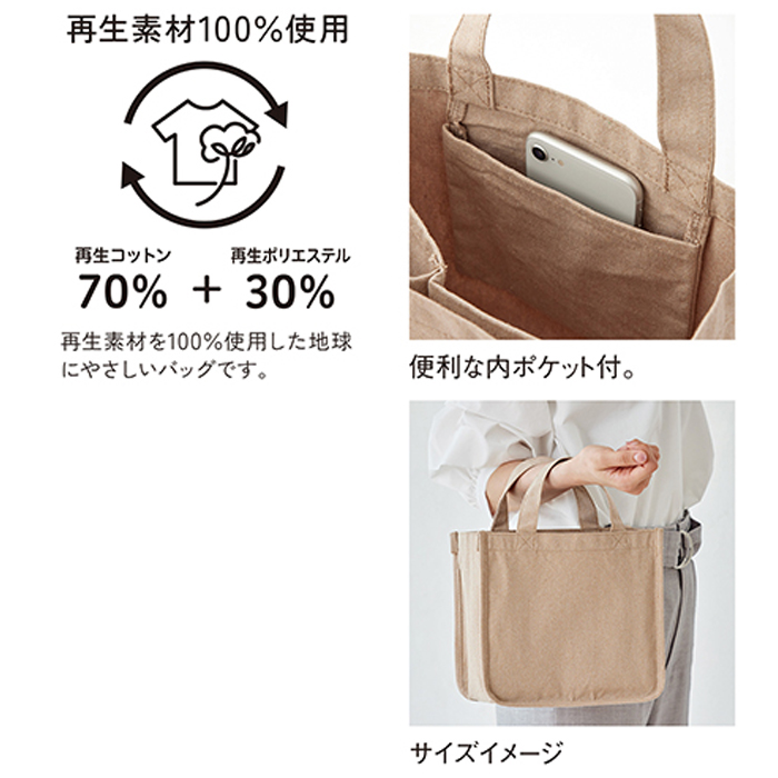 入れるものの大きさに合わせて仕切りが動かせるキャンバストートです。しっかりとしたキャンバス地なのでお出かけだけではなくツールトートとしても活躍!再生コットンと再生ポリエステルを使用した、100%再生素材のトートです。※サイズはあくまでも標準値です。縫製品のため、実際のサイズは異なる場合がございます。