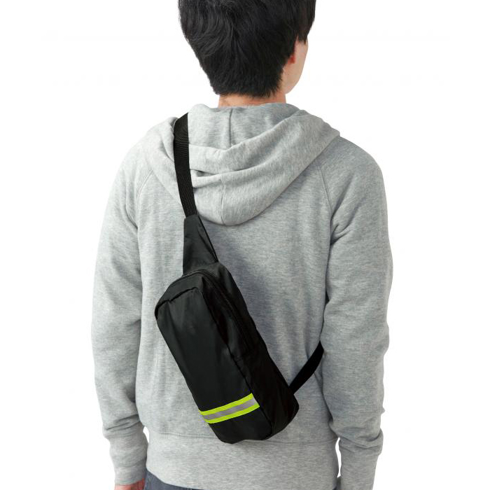 両手が空いて動きやすいボディバッグ(反射テープ付き!)に防災グッズをセットしました。それぞれが自分に必要な防災アイテムを加えればオリジナル防災バッグの完成です。500mlペットボトルも入ります。