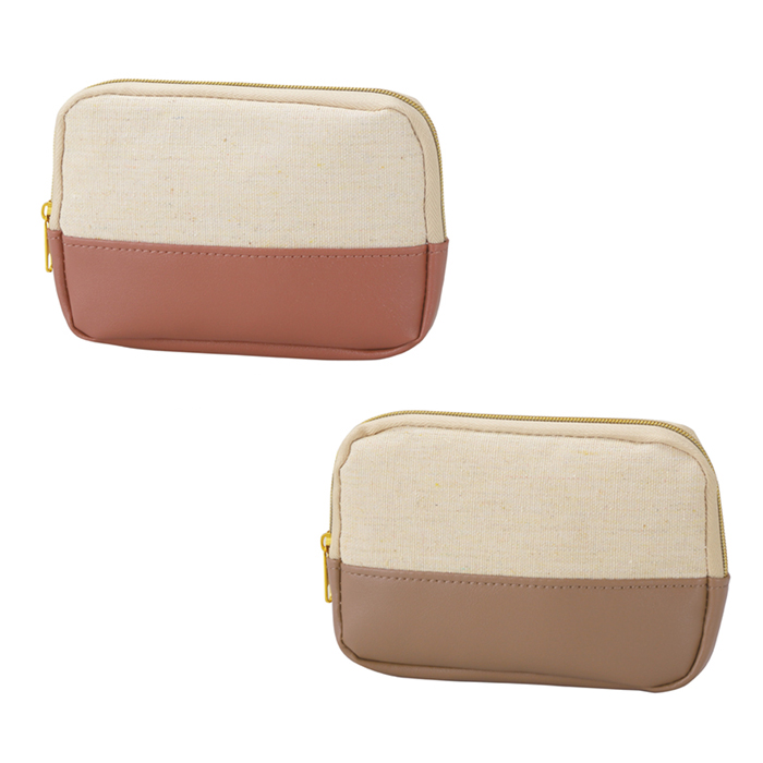 持ち歩きやすいスリムなポーチ。ティッシュポケットを備えてさらに使いやすく。くすみカラーの合皮×ナチュラル生地の、色と素材で遊ぶ大人かわいいデザインです。アイデア次第で様々な使い方ができる多機能性やおしゃれな見た目など、定番販促品こそこだわりが見える一品が◎。美容、インテリアなど各種イベントにおすすめです。企業や会社の販促品・ノベルティでお困りの場合、オシャレで安いオリジナルのものをご提案します。※生地の特性上、色の違う繊維が混入したり、風合いが異なったりする場合がございます。