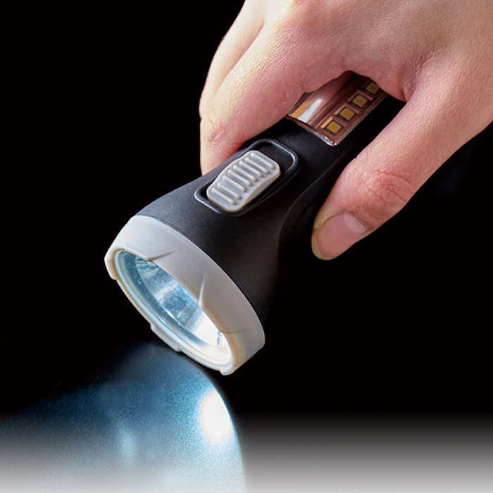 ハンディライト(手持ち)として、卓上ライトとして、2way の使い分けができる、便利なLEDライトです。嬉しいストラップ付きで、暗闇で落とす・なくすを防止してくれます。また、単三乾電池1本(別売り)で使えるシンプルさは、災害時にこそありがたい仕様かも知れません。防災知識が満載のリーフレットも付属しています。本体の黒色部分の90%が再生樹脂で、エコな製品でもあります。企業・団体様が配布される際に、環境重視の姿勢を表すこともできます。電池カバー部分に名入れも可能ですので、社名・団体名を印刷し、社員・市民のみなさまへの配布等もご検討ください。是非、他の防災アイテムとあわせてご検討ください。
