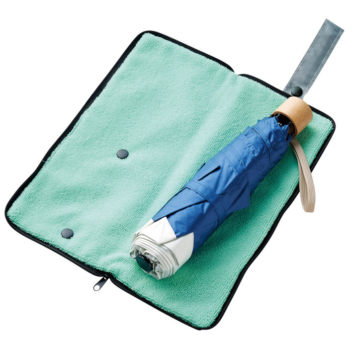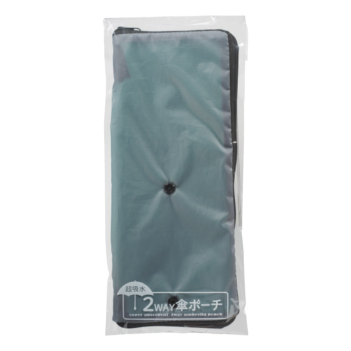 外側生地は撥水加工で雨をはじき、中側は吸水生地で傘の水滴を吸い取るケースです。ボタンでサイズ調整ができ、小さめ折傘にも対応。各種景品や販促品としておすすめです。