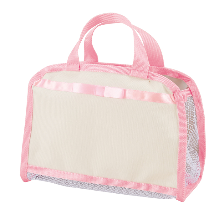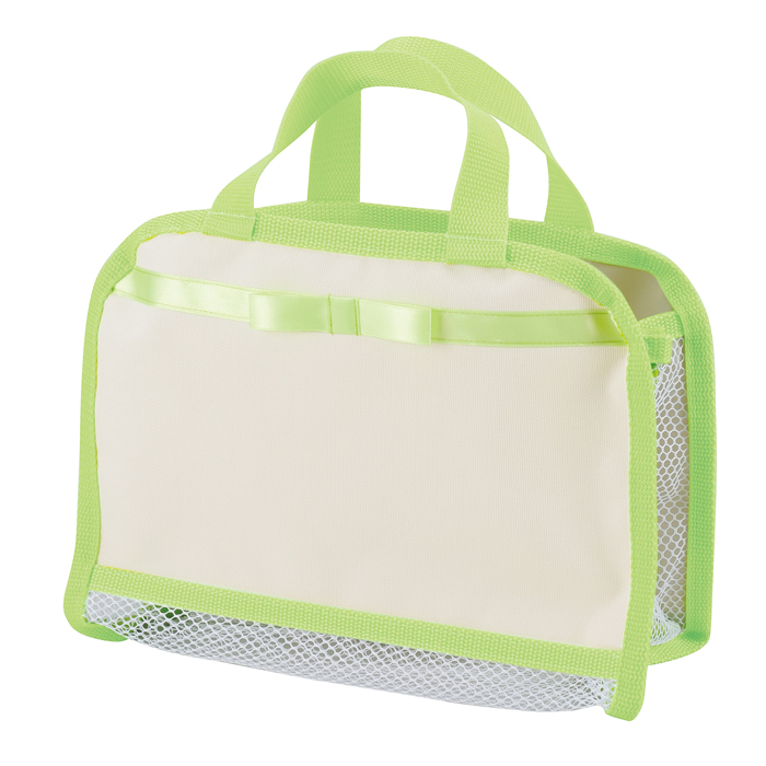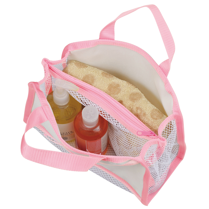 明るい感じのスパバッグです。メッシュ素材を使用しており、中に水滴が溜まりません。持ち帰りの袋は、仕様後の濡れたバッグをそのまま収納できます。